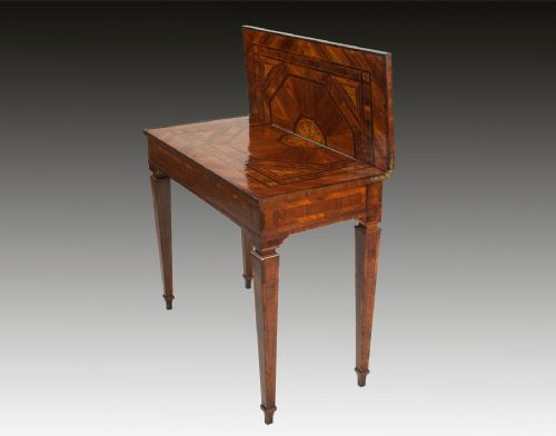 Tavolino da gioco lastronato in ulivo nella struttura e lastronato in bois de rose nel piano , filettato e intarsiato in palissandro e bosso, il piano apribile è impreziosito da riserve geometriche decorate agli angoli da fiori e foglie e motivo di foglie di quercia formano un fiore al centro . Gambe troncopiramidali.